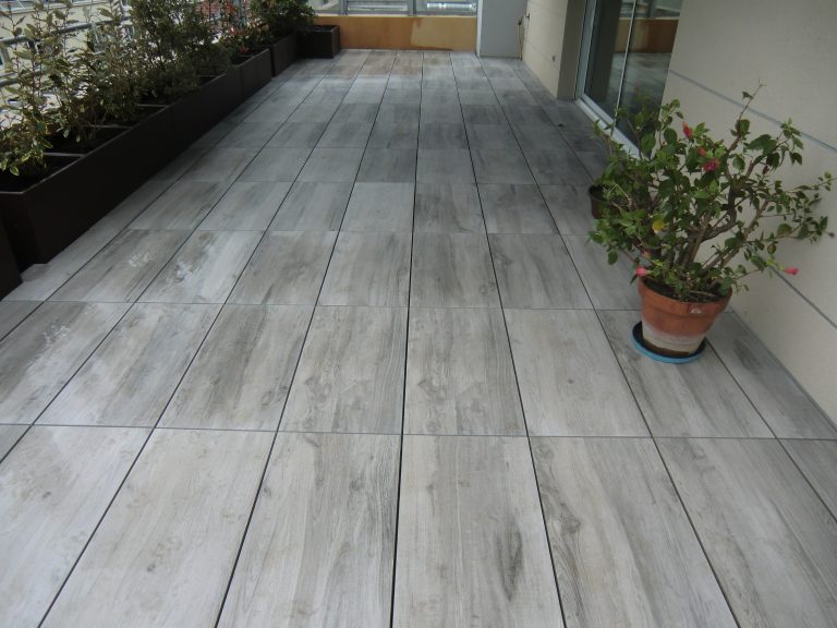 Cette dalle en grès cérame épaisseur 2 cm imite parfaitement le bois.